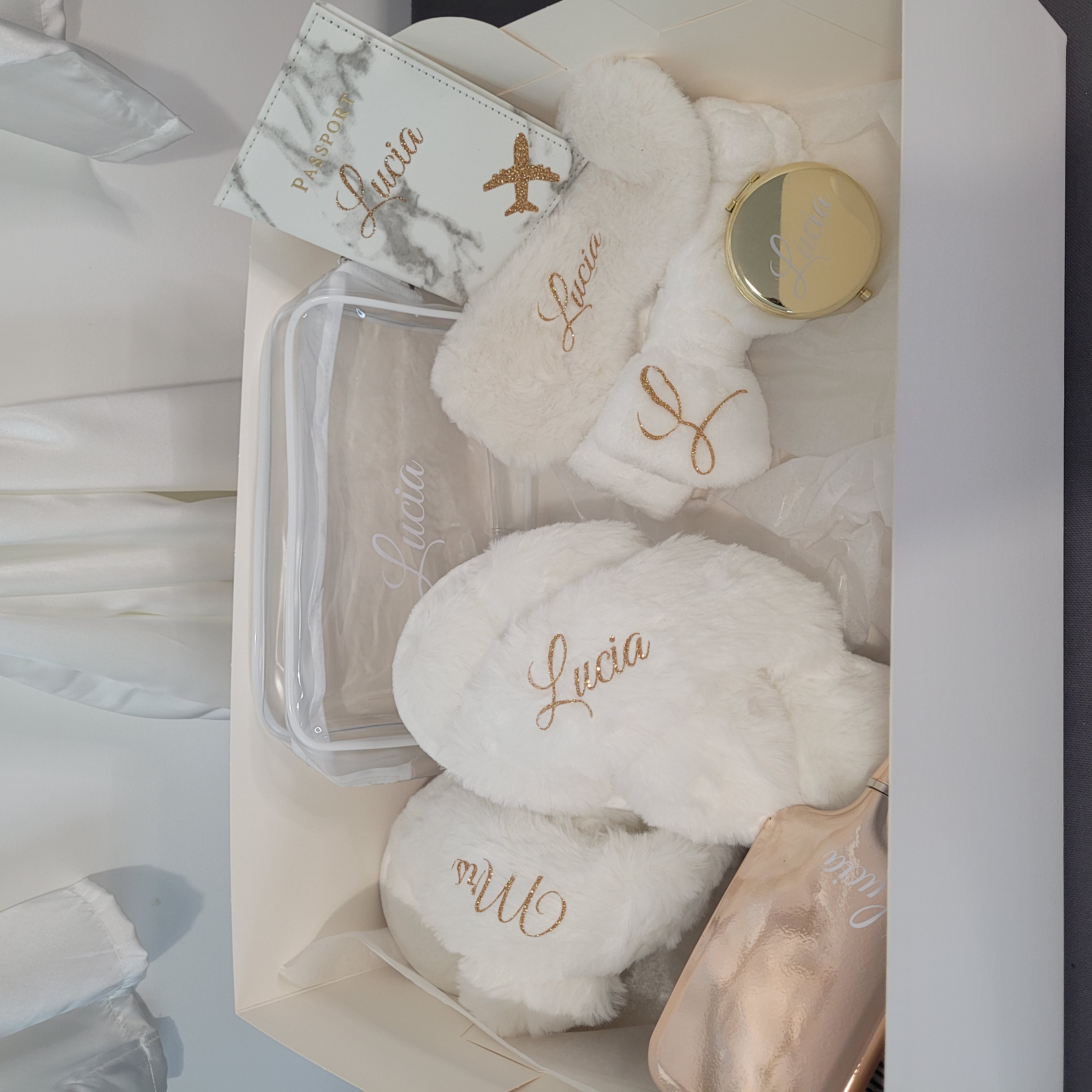 Apprends à personnaliser peignoir, chaussons, trousse, mirois et brosse à cheveux.